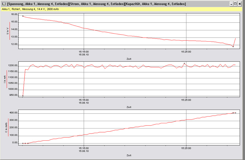 Im Beispielbild sieht man eine Messung an einem defekten Akku . Statt der angegebenen 2600 mAh hat er nur noch 400 mAh Kapazität .